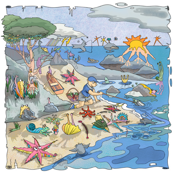 Над дальними горами появился нежный розовый просвет. С первым лучом солнца мидии раскрыли свои раковины. Крабы деловито шастали на мелководье между ними, здороваясь и элегантно кланяясь. Тихо выползали на завтрак морские существа, с осторожным любопытством поглядывая на собирателя водорослей.