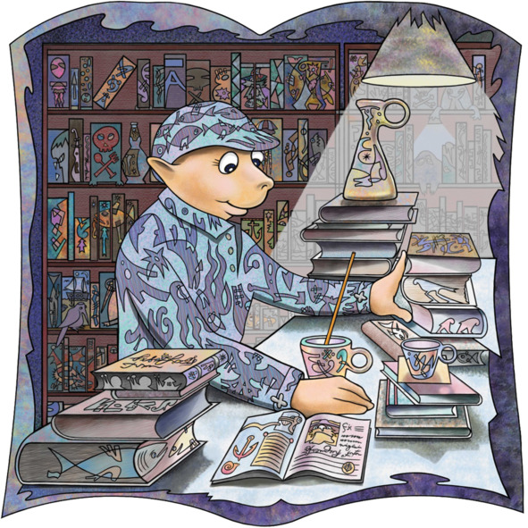 Пока ёжик и Гномарь заканчивали сборы, Потассум спустился в подвал под Старым Дубом. Там располагалась не только лесная библиотека, но и летописная мастерская, где наш герой заносил все важные события в специальную книгу. Когда-то давно Магистр Белой Магии Пингвус передал ему обязанность вести Книгу Лесного Бытия, и теперь Потассум с гордостью её исполнял.