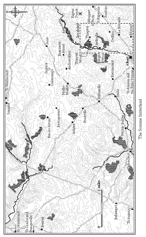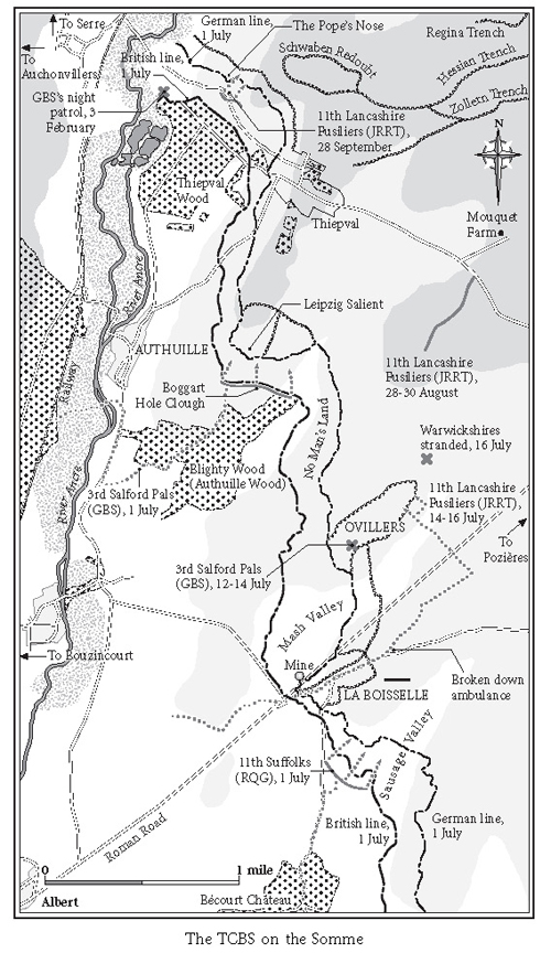 It may be noted here that, although full and detailed surveys of the source material have been published for Smith’s and Gilson’s battalions (by Michael Stedman and Alfred Peacock, respectively), no similar synthesis has been attempted for Tolkien’s for more than fifty years; and none, I believe, that has made use of a similar range of eyewitness reports. This book therefore stands as a unique latter-day account of the experiences of the 11th Lancashire Fusiliers on the Somme. Since my narrative is not primarily concerned with matters of military record, however, I have been at pains not to overburden it with the names of trenches and other lost landmarks (which often have variants in French, official British, and colloquial British), map references, or the details of divisional and brigade dispositions.