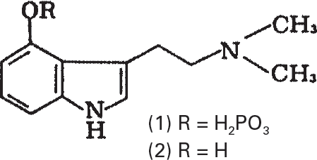 Strukturformel von Psilocybin (1) und Psilocin (2).