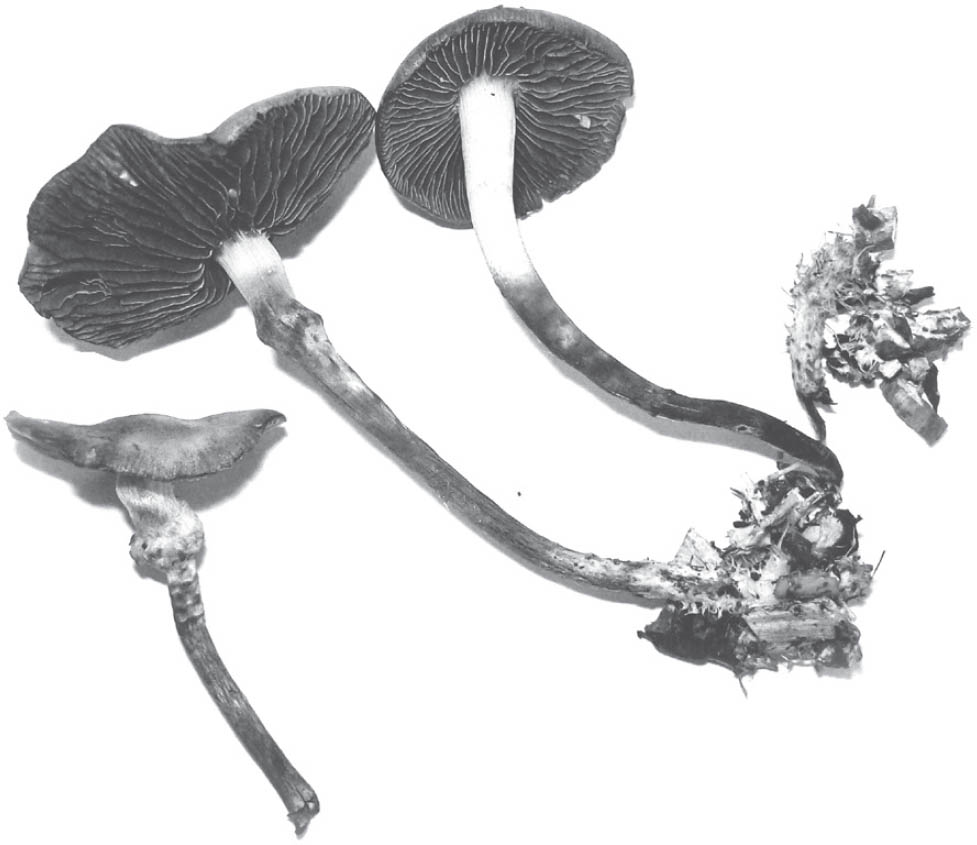 Herkunft Psilocybin (%) 1. Dübener Heide, Ostdeutschland 0,96 2. Prag, Mittelböhmen 1,05 3. Krasna Lipa, Nordböhmen 0,91 4. Norwegen 0,95 5. Pazifischer Nordwesten, USA 0,93 6. Niederlande 0,97Aufsammlungen von Psilocybe semilanceata aus England, Schottland, Norwegen, aus Finnland, aus Belgien und Holland, Deutschland, Frankreich, den USA sowie aus der Schweiz und der Tschechoslowakei wurden meist umfassend analysiert. Dabei fand man, dass der Alkaloidgehalt bei der gemeinsamen Analyse mehrerer Pilze zur Ermittlung eines Durchschnittswertes unabhängig vom Herkunftsland um 1% in den Trockenpilzen liegt. Es wurde schon oft über chemische Rassen bei Pilzen diskutiert, z. B. beim Fliegenpilz, aber nachgewiesen wurde eine solche bei den höheren Pilzen – im Gegensatz zu den Pflanzen – noch nicht. Die vorgestellten Resultate sprechen alle gegen eine Variabilität in den grundlegenden chemischen Substanzen im Pilz. Unter den hier abgehandelten Arten scheinen Psilocybe semilanceata und Inocybe aeruginascens (Kapitel 2.5) die Pilze zu sein, deren Gehalt an Psilocybin in den einzelnen Fruchtkörpern am wenigsten variiert. Von den in Tabelle 1 dargestellten Analyseergebnissen stammen die ersten drei von eigenen Untersuchungen, die zusammen mit einer Arbeitsgruppe aus Prag durchgeführt wurden. Frische Pilze enthalten etwa 90% Wasser, d. h. in einem Gramm ist durchschnittlich 1 mg Psilocybin enthalten.