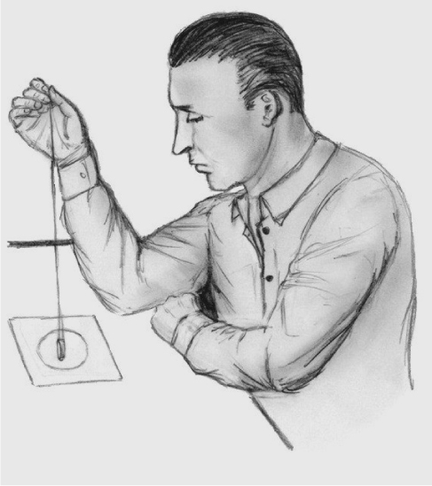 Nehmen Sie die beiliegende bzw. ausgedruckte Pendeltafel und das Pendel. Setzen Sie sich an einen Tisch (Abb. 2). Nun halten Sie das Pendel über den dicken Punkt in der Mitte des Kreises und versuchen, es soweit wie möglich zum Stillstand zu bringen. Notfalls können Sie es mit der linken Hand eine zeitlang festhalten. Wenn es stillsteht, die Hand wieder wegnehmen. Nun entspannen Sie sich am ganzen Körper und besonders die Arme, und sehen Sie auf das Pendel (auf den Gegenstand den Sie als Pendel verwenden.) Versuche Sie nun, sich lebhaft vorzustellen, dass das Pendel rechts herum im Kreis, also im Uhrzeigersinn, zu kreisen beginnt. Je lebhafter Sie sich das vorstellen, um so schneller beginnt das Pendel, sich in der vorgestellten Richtung zu bewegen. Denken Sie bei diesem Versuch an nichts als nur an das Pendel, und stellen Sie sich ganz, ganz lebhaft vor, wie das Pendel rechts herum kreist. Der Versuch gelingt am besten, wenn Sie folgendes beachten:
