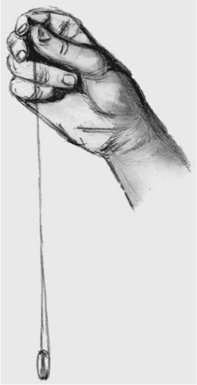 Fertigen Sie sich selber so ein Pendel an. (Abb. 1) Es besteht aus einem dünnen Faden und einem daran befestigten Gewicht, wofür Sie entweder einen Siegelring, eine Metallkugel oder sonstige kleine Gegenstände nehmen können. Der Faden soll 40 bis 60 cm lang und nicht zu dick sein. Das Material spielt keine Rolle.