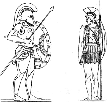 Греческие латники. Бронзовый панцирь скреплялся из двух половин, защищавших грудь и спину; снизу пристегивался кожаный или войлочный передник, часто с нашитыми металлическими полосами. На голове шлем с гребнем: у одного воина с забралом, у другого – с открытым лицом; на ногах у одного – поножи, подбитые кожей. Живот был прикрыт только щитом