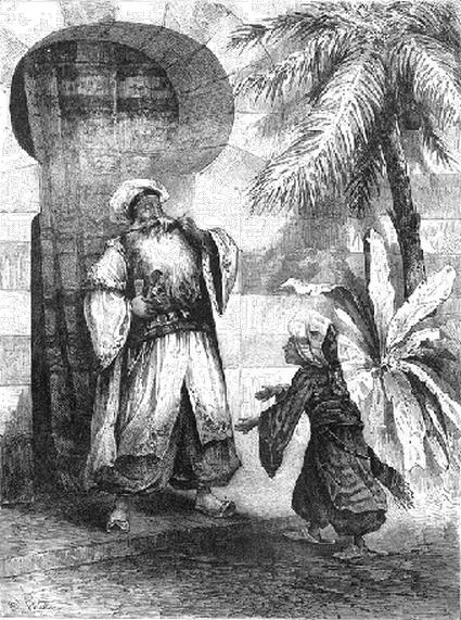 Однажды старик неудачно упал, расшибся и умер, оставив Маленького Мука бедным и неученым. Жестокие родственники, которым умерший был должен больше, чем мог заплатить, выгнали бедного малютку из дома и посоветовали ему идти по свету и искать свое счастье. Маленький Мук отвечал, что он уже готов в путь, но просил себе только отцовскую одежду, которую ему и отдали. Его отец был высоким, сильным человеком, и поэтому его платье не годилось сыну. Однако Мук скоро нашелся: он обрезал то, что было слишком длинно, и потом надел. Но он, по-видимому, забыл, что должен обрезать и в ширину, и вот почему на нем та странная одежда, которую можно видеть еще и теперь: большой тюрбан, широкий пояс, широкие шаровары, синий плащик – все это наследство его отца, которое он носит с тех пор. Он заткнул за пояс длинный дамасский кинжал своего отца, взял палочку и вышел за ворота.