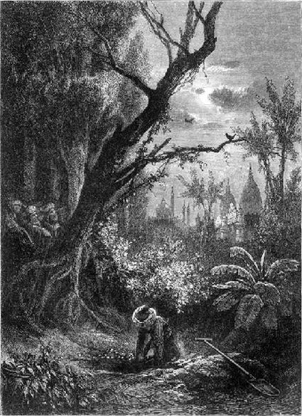 Однажды вечером случай привел его в отдаленную часть дворцового сада, которую он мало посещал. Вдруг он почувствовал, что палочка в его руке вздрогнула и три раза ударила о землю. Теперь он уже знал, что это могло значить. Поэтому он вынул кинжал, сделал знаки на стоявших кругом деревьях и прокрался опять во дворец. Там он достал заступ и для своего предприятия стал дожидаться ночи.