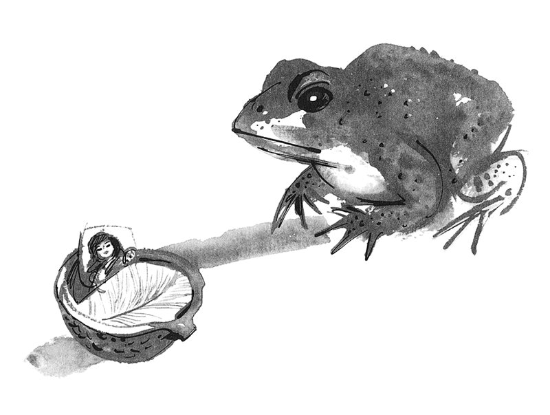 – Вот и жена моему сынку! – сказала жаба, взяла ореховую скорлупу с девочкой и выпрыгнула через окно в сад.