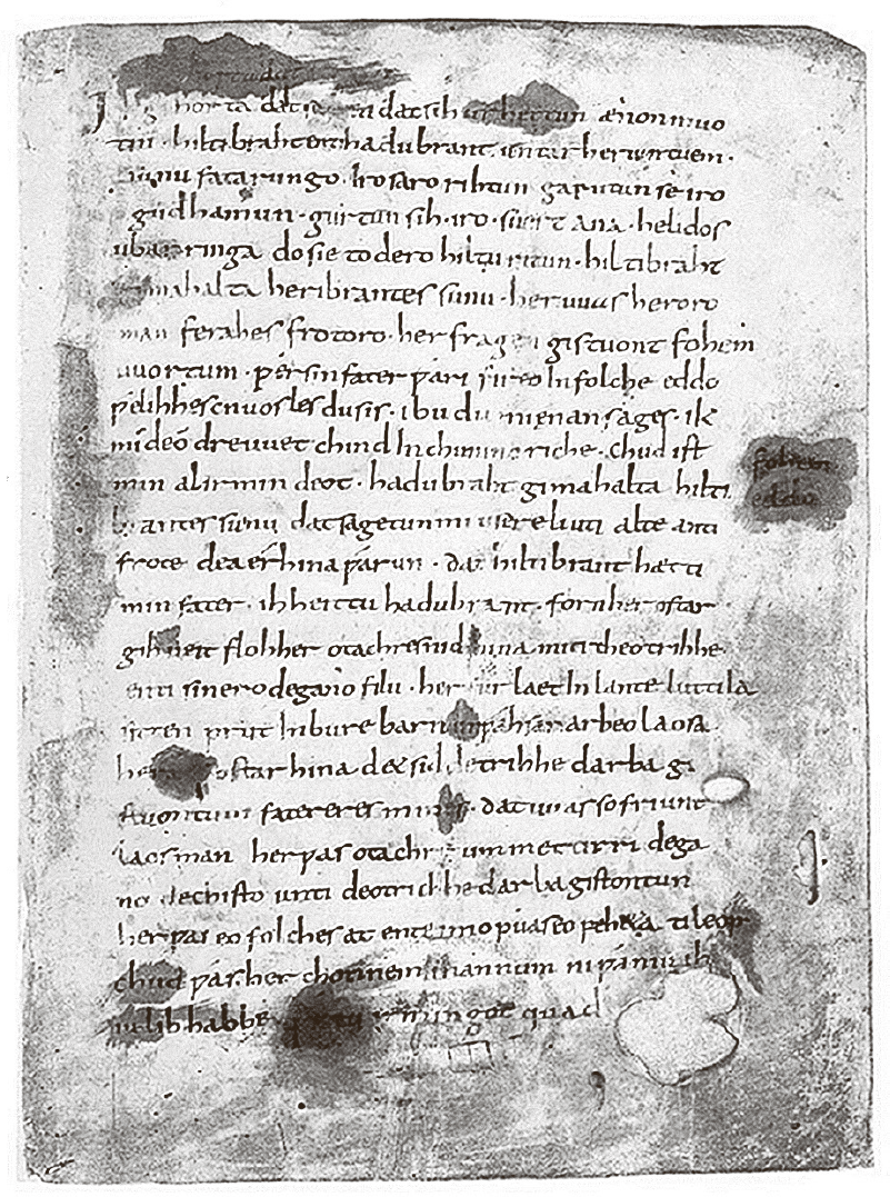Erste Seite des Hildebrandsliedes, eines der frühesten Textzeugnisse deutscher Sprache (9. Jahrhundert). Es erzählt eine Episode aus dem Sagenkreis um Dietrich von Bern, eine Zweikampf-Situation zwischen Hildebrand und seinem Sohn Hadubrand. Da der Schluß verloren ist, weiß man nicht, ob das Lied tragisch oder glücklich endet.