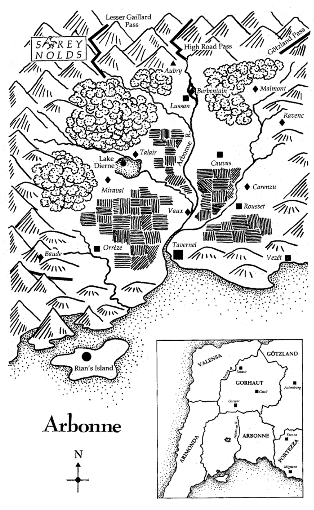 There were ruins of the Ancients all over the fertile land named for the Arbonne River that watered it: columns by the roadside, temples on cliffs by the sea or in the mountain passes, foundations of houses in the cities, bridge stones tumbled into the mountain streams and some still standing, some still in use. Many of the roads they rode or walked today had been built by the Ancients long ago. The great high road beside the Arbonne itself, from the sea at Tavernel north to Barbentain and Lussan and beyond them into and through the mountains to Gorhaut, was one of the old straight roads. All along its length were marker stones, some standing, many toppled into the roadside grass, with words upon them in a language no one living knew, not even the scholars of the university.
