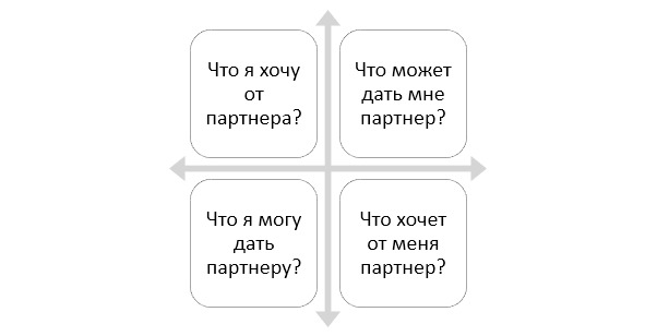 Для взаимопонимания всего-то нужно сопоставить потребности, которые каждый удовлетворяет во взаимоотношениях. Следует ответить на 4 вопроса: что я хочу от отношений? что партнер может мне дать? что партнер хочет от отношений? что я могу ему дать?