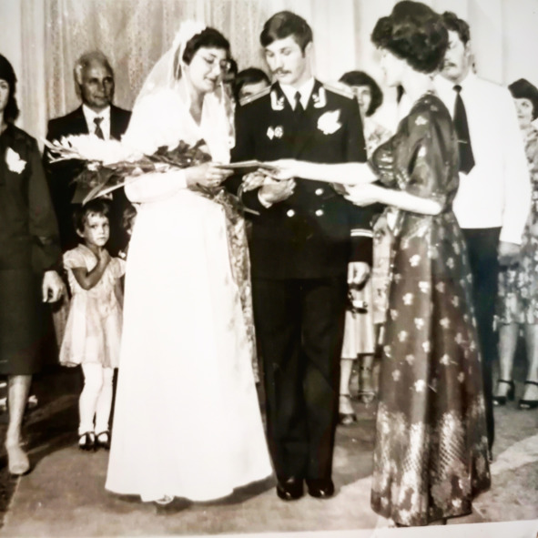 Большую часть времени жених проводил с балагуром Володей, остановившегося в их квартире. Я не почувствовала какой-то торжественности происходящего, какого-то таинства… Все сновали из квартиры в квартиру, нервно смеялись, громко балагурили. Наверное, сказывалось охватившее всех волнение. В последний момент у меня началась диарея. Но, слава Богу, все позади: жених явился, преодолев все преграды и даже готовый выхватить кортик из золотистых ножен, чтобы заставить расступиться откуда-то набежавших пожилых женщин из нашего двора. Рука об руку мы спустились во двор и поехали в ЗАГС.