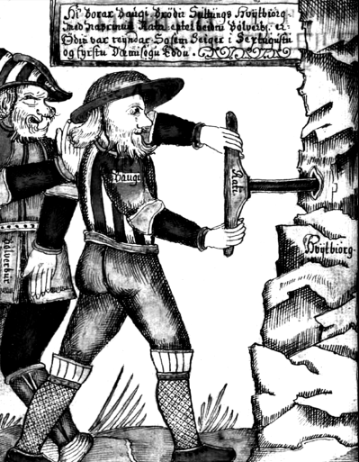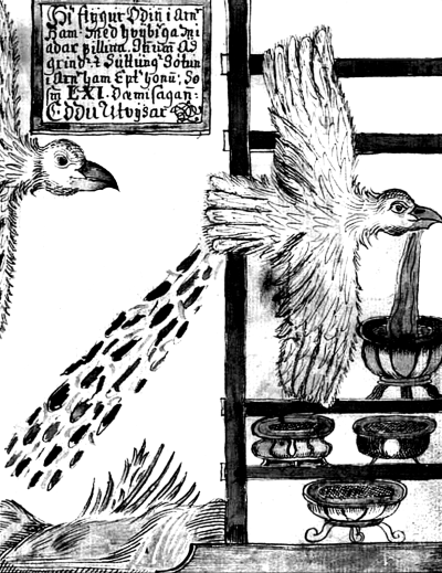 Эпизод похищения Одином меда поэзии. Сцены из исландского рунического манускрипта 1730-х годов