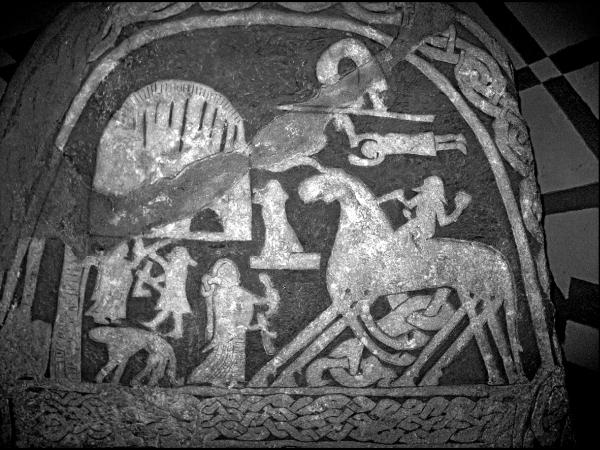 Валькирия с рогом мёда встречает Одина, приезжающего на восьминогом коне Слейпнире. Рельеф на руническом камне с о. Готланд