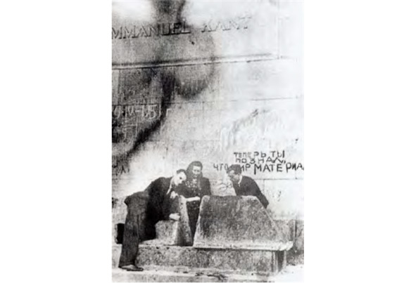 В конце 40-х, когда я побывал на могиле Канта, она имела, мягко говоря, непрезентабельный вид. Впечатление такое, будто здесь веселились на пикниках. Могила кощунственно утопала в конфетных обёртках, стаканчиках из-под мороженого, окурках и прочем мусоре. Но не это особенно удручало, а надписи. Ими изрисовали стену разрушенного собора, к которой притулилась высокая каменная плита, в виде гроба, накрывавшая последнее пристанище учёного. Там отметились, разумеется, обычные мазилы-хулиганы, привыкшие похабно выражаться устно и письменно, где попало. Но попадались и некие философские, критические, даже назидательные надписи. Мне запомнилась такая фраза: «Теперь ты познал, что мир материален?» Видно оставил сию надпись студент, которого достало обязательное изучение диалектического материализма, и у которого застряло в мозгу, что Кант метафизик, а, следовательно, враг материализма. На фото, сделанном в 1951 году, хорошо читается эта надпись.