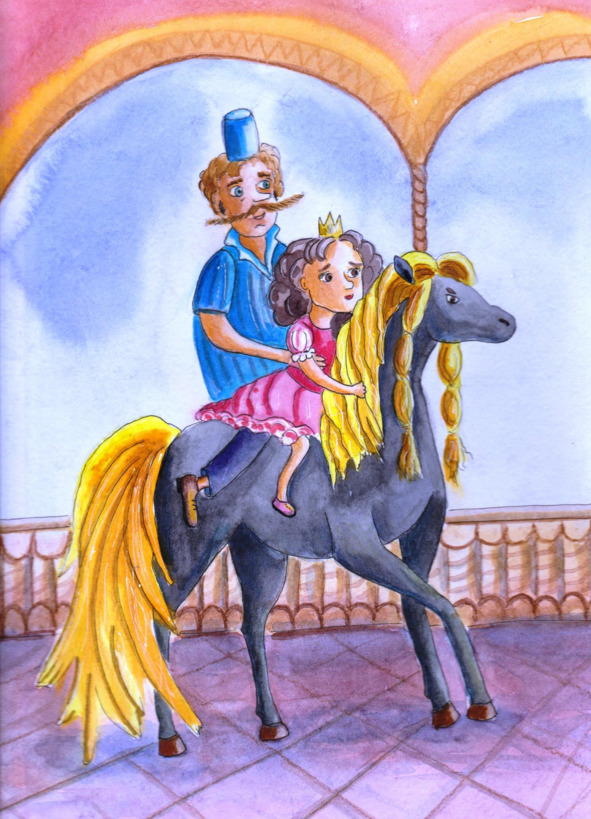 Как только Катюшка договорила, вокруг поднялся ветер, в окно налетела зеленая листва с неведомых волшебных деревьев, в воздухе закружилась стайка маленьких голубых бабочек, затем послышался стук копыт, по мраморному полу Катюшкиных покоев, звонкое ржание и, наконец, в золотом сиянии появился красивый рябой конь, с длинной, заплетенной в косу гривой и золотым хвостом, перевязанным синей ленточкой.
