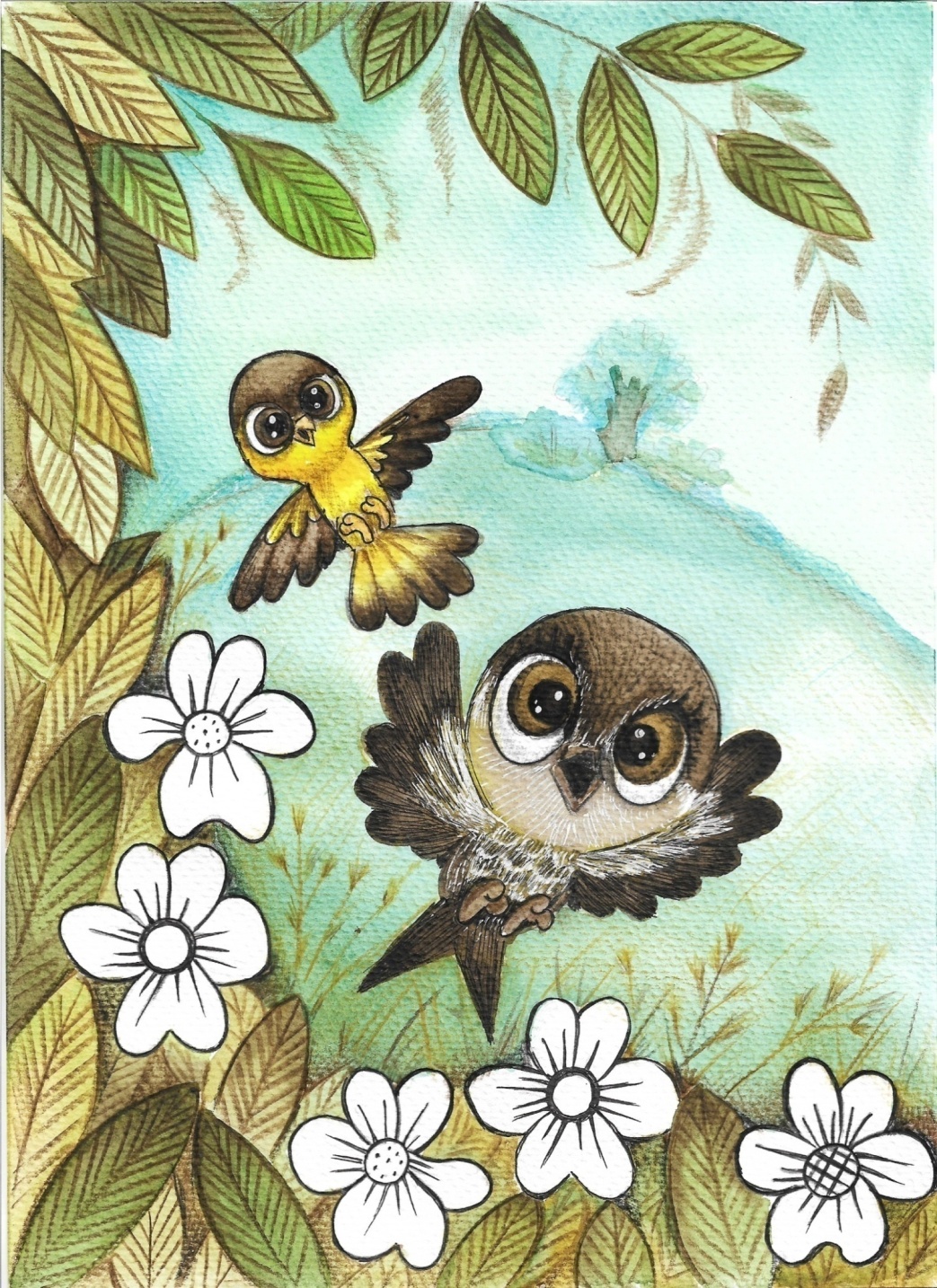 Пернатые друзья часто находят красивые и необычные места. Например, на этой полянке им попались совершено одинаковые цветы! Найди на картинке одинаковые цветы и раскрась их в свои любимые цвета