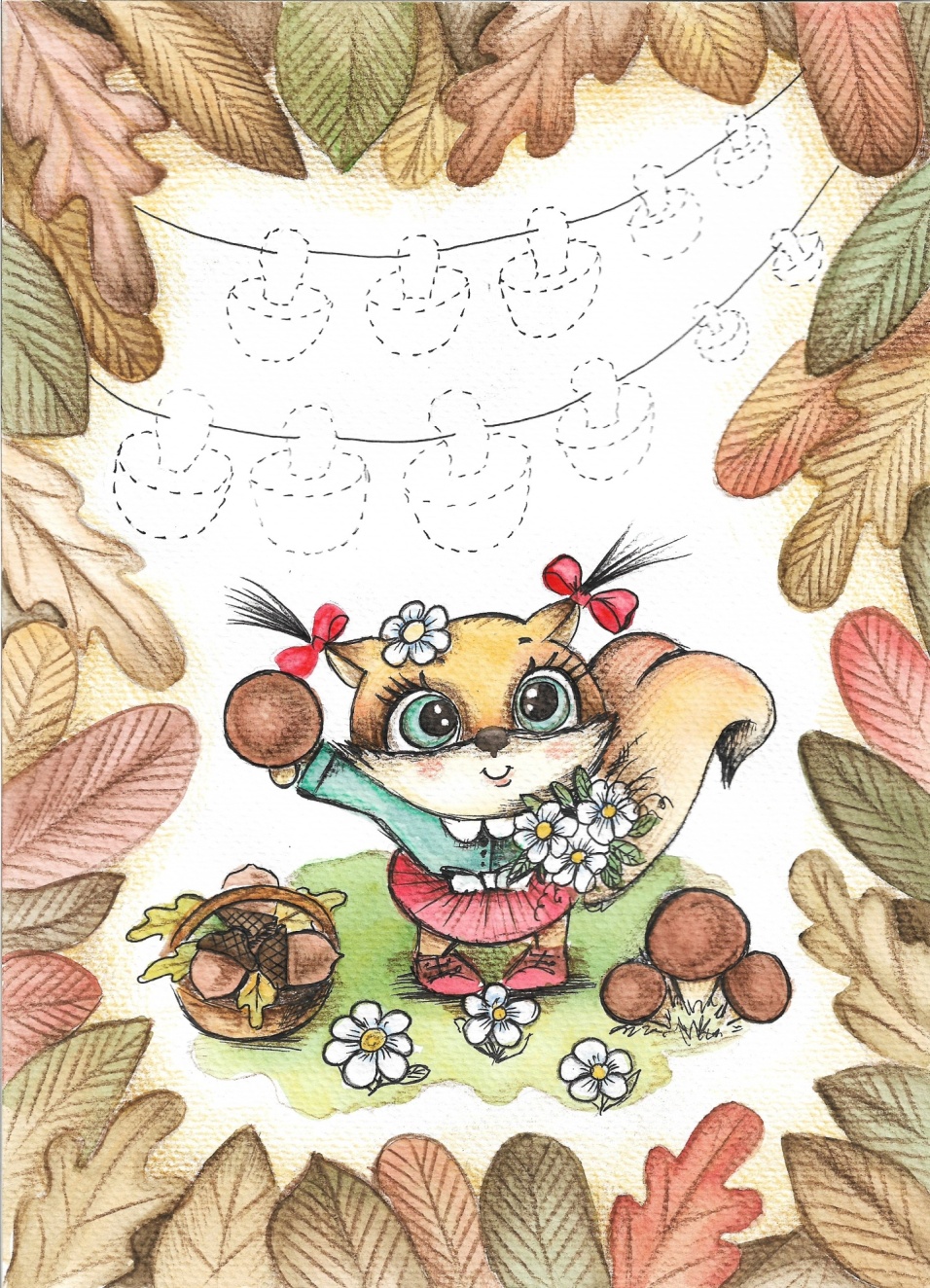 Как ты думаешь, какие грибочки сушит белочка? Обведи их по линиям, раскрась и придумай веселые названия!