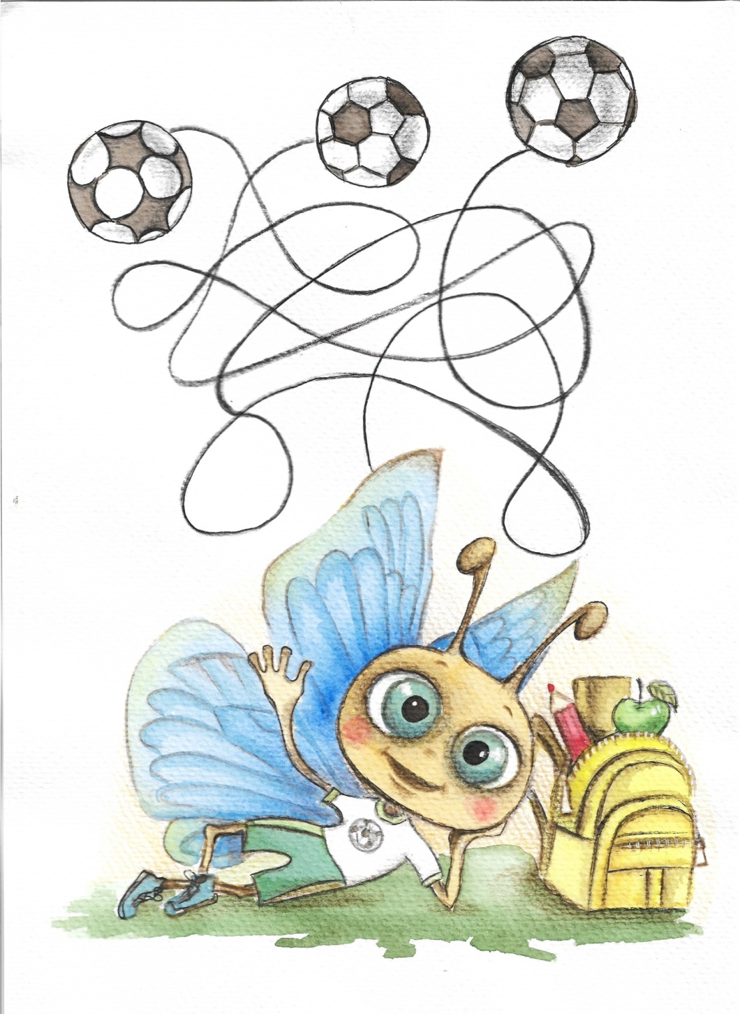 Кажется Васёк чуть не упустил свой мяч! Нужно срочно помочь его отыскать. Проследи за тем, куда ведут линии и помоги мотыльку поймать мяч.