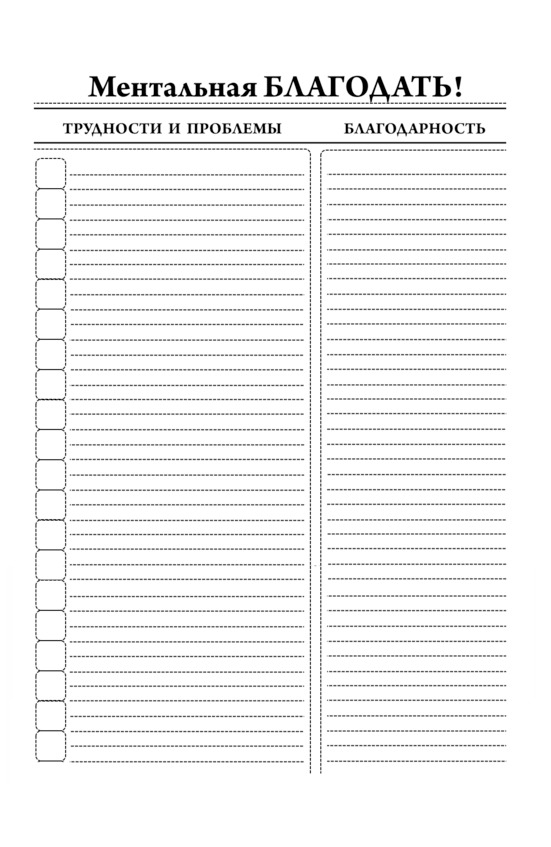 Напишите в левой колонке минимум 10 проблем или неприятных ситуаций за сегодняшний день. Запишите все, что Вас расстроило сегодня! Когда этот список будет закончен, отдохните 5—7 минут. Затем возьмите ручку и вернитесь к списку. В правой колонке напишите, за что вы благодарны Вселенной в этой ситуации (например, что все решилось благополучно, что вы получили урок с наименьшими потерями). Проникнетесь этим чувством!