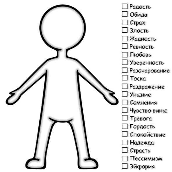 Посмотрите на список эмоций, который получился, и перенесите их на человечка, нарисовав каждую эмоцию в теле особенным цветом, размером или формой в том месте, где она проявляет себя в теле. А теперь посмотрите на рисунок и определитесь, какими эмоциями вы живете.