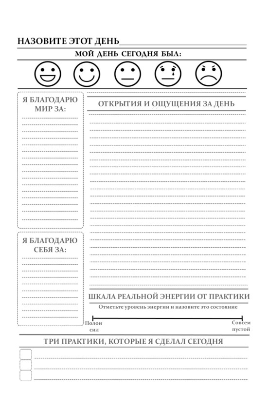 А какие открытия вам помогло сделать это упражнение, запишите все свои открытия и ощущения на листе-отчете. Попробуйте делать это упражнение не менее 10 дней и записывать, на сколько, увеличивается Ваша продуктивность и количество положительных эмоций, на сколько, ваш внутренний стержень окреп и как Вы стали справляться с эмоциональными трудностями, появились ли в Вашей жизни новые методы борьбы со стрессами и авралами.