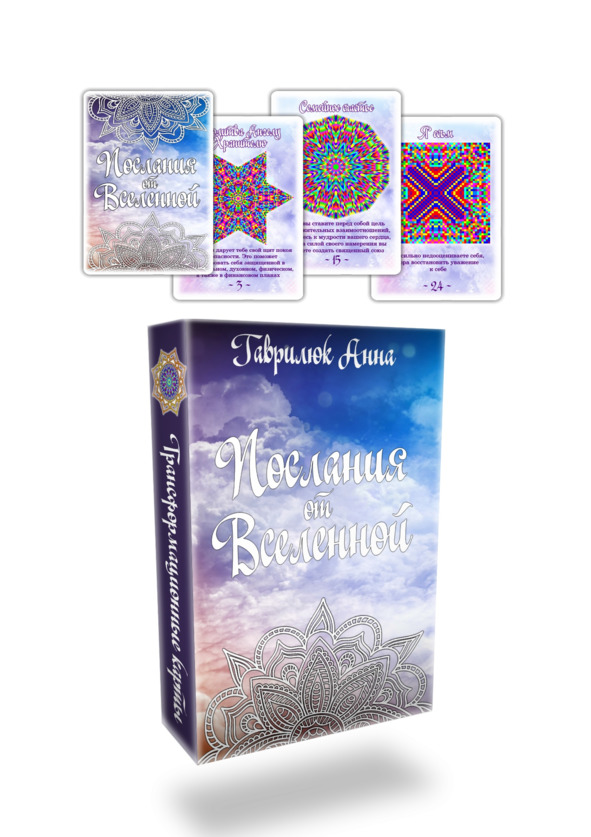 Набор трансформационных карт «Послания от Вселенной» – это настоящий помощник с волшебными мандалами Сети Света, глядя на которые уже происходит чудо… Метод Мандала – одно из самых сильных и эффективных средств, которое даёт человеку жизненные силы, помогает стать тем, кем человек есть на самом деле. Этот метод может подойти всем и что самое главное, он не имеет противопоказаний.
