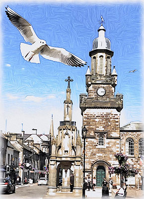 Центральная улица города длиной в несколько сот метров почти полностью сохранила первозданный вид. Целых четыре церкви разных конфессий каким-то чудесным образом вписались в это скромное пространство. А главным украшением улицы были символы бывшего Королевского города: роскошный Торговый крест, похожий на дворец в миниатюре, и величественный Толбус[3] с четырьмя коническими башнями по периметру и золоченым петухом-флюгером наверху – прямо как в пушкинской «Сказке о золотом петушке»!