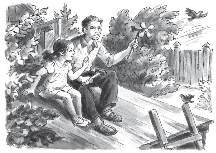 Посмеялись мы и думаем: вот подует ветер, закружится, зажужжит наша быстрая вертушка. Ото всех дворов сбегутся к нашему дому ребятишки. Будет и у нас тогда своя компания. А завтра что-нибудь ещё придумаем.