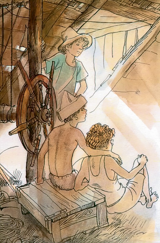 Ей стало весело. Она повернула штурвальное колесо. Тугие веревочные провода задрожали, загудели. Ветер зашумел и погнал зеленые волны. А ей показалось, что это ее корабль-сарай медленно и спокойно по волнам разворачивается.
