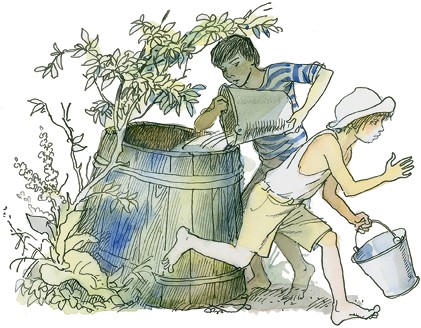 Обливая холодной водой босые ноги, мальчишки мчались во двор, опрокидывали ведра в дубовую кадку и, не задерживаясь, неслись обратно к колодцу.