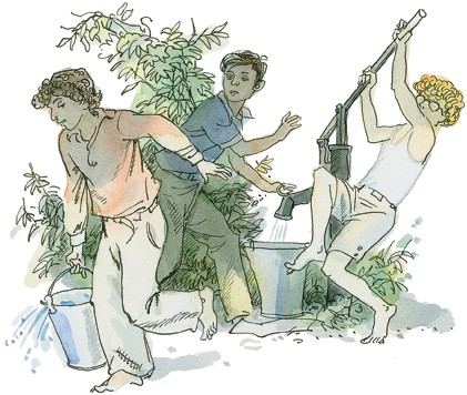 Рассвело. Пропел деревянный рог пастуха. Старуха молочница открыла калитку и погнала корову к стаду. Не успела она завернуть за угол, как из-за куста акации, стараясь не греметь пустыми ведрами, выскочило пятеро мальчуганов, и они бросились к колодцу.