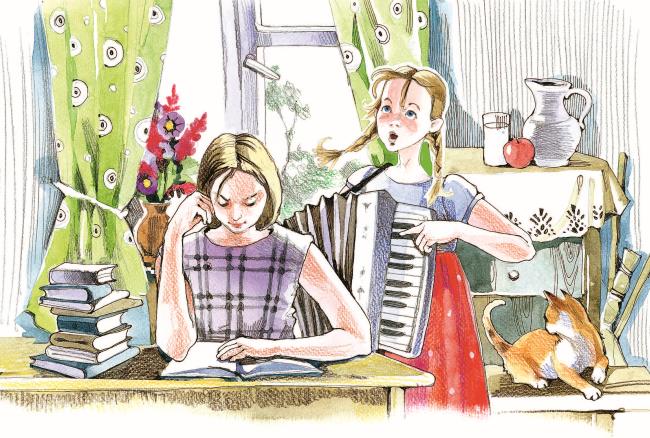 – «Очень, – говорит он, – твоя сестра хорошо играет. Она не хочет ли учиться в консерватории?» (Женя достала аккордеон и перекинула ремень через плечо.) «Нет, – говорю я ему, – она уже учится по железобетонной специальности». А он тогда говорит: «А-а!» (Тут Женя нажала один клавиш.) А я ему говорю: «Бэ-э!» (Тут Женя нажала другой клавиш.)