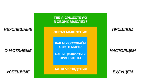 Продолжаем идти по воображаемому пути нашей мысли. Эта мысль оттолкнулась от нашей самооценки и ценностей, прошла слой образа нашего мышления и подошла к временному слою, а именно «где мы существуем в наших мыслях чаще всего – в прошлом, настоящем или будущем?»