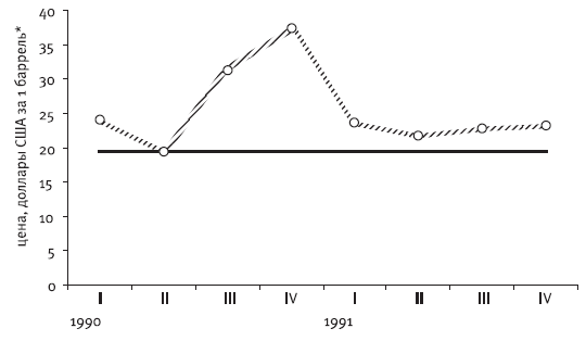 Рис. 3.15. Поквартальная динамика цены на нефть в 1990–1991 гг. на фоне среднего исторического уровня