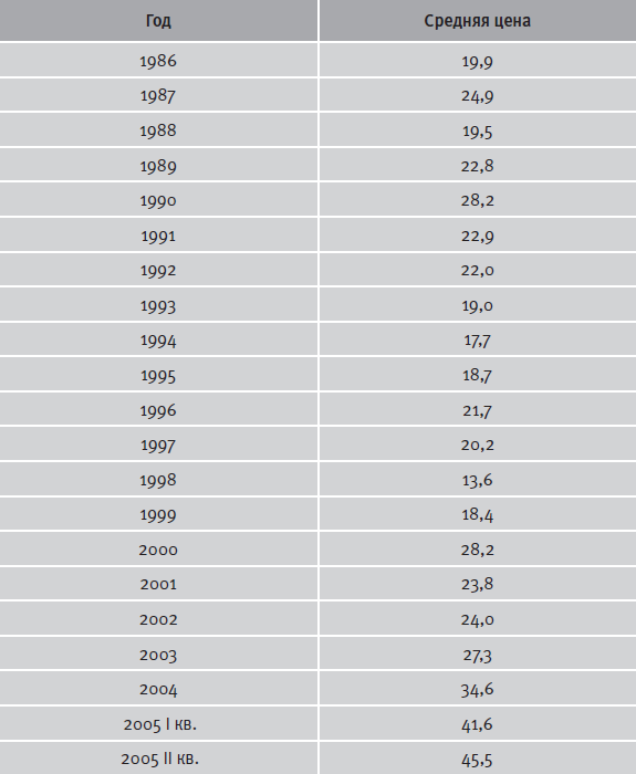 Таблица 3.7. Динамика мировых цен на нефть в 1986–2005 гг. (долл. за 1 баррель[212])