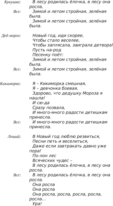 Ой-ёй-ёй-ёй-ёй-ёй-ёй! Начинать надо весело, с песенки. Смотри! (Набрасывает шубу себе на плечи, изображает деда Мороза) Так вот сразу выходим и: «В лесу родилась ёлочка…»
