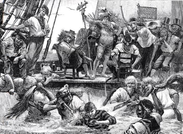 Затем Нептун весело приветствовал всех путешественников с благополучным прибытием в южные владения морского царя и приступил к своеобразному шуточному обряду крещения новичков, впервые попавших в Южное полушарие.