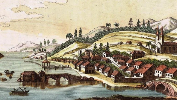 Вид города Ностра-Сенеро-дель-Дестеро на острове Санта-Катарина. Рисунок из «Кругосветного путешествия…», т.I на итальянском языке См. также «Атлас…», гравюра IV.