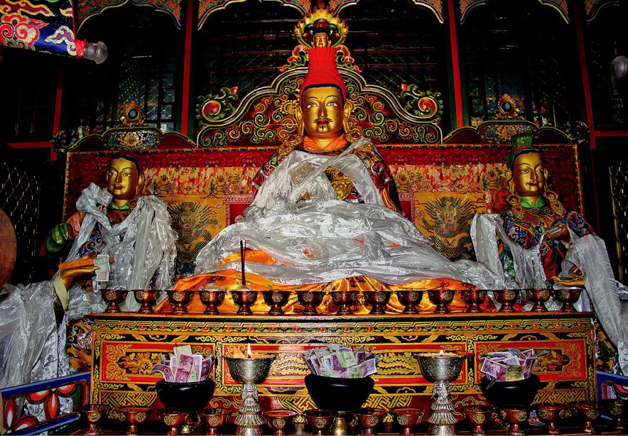 Статуи Сонгцена Гампо, принцессы Трицун и принцессы Вэньчэн, хранящиеся в храме Трандрук в префектуре Шаньнань, Тибет