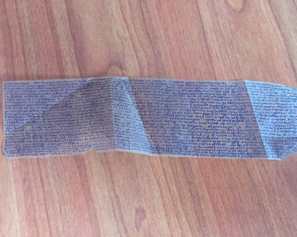 Он уходит и возвращается с конвертом, из которого вываливаются прозрачные длинные отрезы бумаги, исписанные крохотным, миллиметровым почерком.