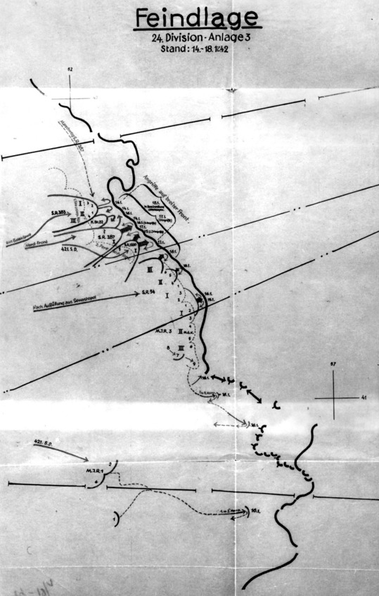 «Атака 16 января была проведена следующим образом: батальон был проведен через овраг проводником, знающим местность, и атаковал немецкие линии из оврага. Таким образом, плацдарм должен быть у подножия оврага».