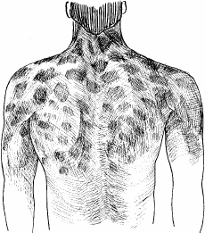 Пятно (макула) – ограниченное, на большем или меньшем участке изменение окраски кожи без нарушения ее рельефа и консистенции. Пятна бывают сосудистые, пигментные и искусственные. Чаще всего пятна имеют различные оттенки красного цвета (от светло-розового до вишнево-красного). Сосудистые пятна образуются от расширения кровеносных сосудов. Они исчезают при надавливании на них пальцем. Множественные пятна небольшой величины (диаметром до 2 см) называют розеолой, крупные пятна – эритемой. Если возникновение сосудистого пятна связано с выходом крови из сосуда в результате разрыва сосудистой стенки или из-за увеличения ее проницаемости, его называют геморрагическим. При надавливании оно не исчезает.