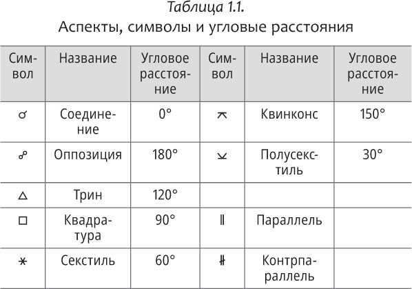 Взглянем на полный список аспектов, которые будут нас интересовать. Они перечислены в таблице 1.1, где также указаны их символы и соответствующие им угловые расстояния.