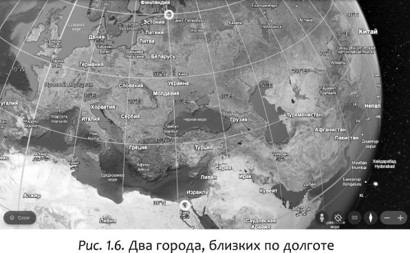 Если бы мы в географии пользовались одной лишь долготой, то могли бы предположить, что Санкт-Петербург и Каир (рис. 1.6) находятся очень близко друг к другу, потому что их долгота практически одинакова. В астрологии это считалось бы соединением. Чтобы избежать путаницы, для любой точки на земном шаре используется географическая широта, координата Y. Она позволяет однозначно определить положение города на карте.