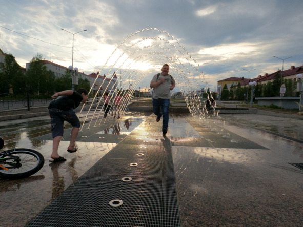 +27°С. Дети купаются в шутейном фонтане. Некоторые мокрые с ног до головы в обычной одежде, но одна девочка бегает прямо в купальнике. Всем весело. На заметку администрациям других городов.