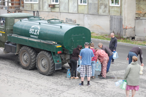 Парни «поймали» бочку с водой и залили все наши ёмкости. Водовозка ездит по вторникам и пятницам.