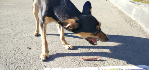 С 12 июня копим куриные косточки для собаки, с которой познакомились во дворе. Хозяева уехали в отпуск и оставили её на попечение двора. Андрей-вездеход мгновенно присвоил ей гордую кличку «Койот». Сегодня вижу Койота и иду за костями, а там уже пакет величиной с эту собачку. Очень аккуратная и деликатная сучка благодарно покушала с рук.