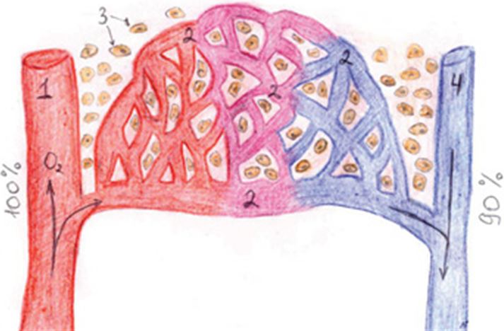 Рис. 1. Артериальные и венозные капилляры. 1 – артериола, 2 – капилляры, 3 – клетки организма, 4 – венула