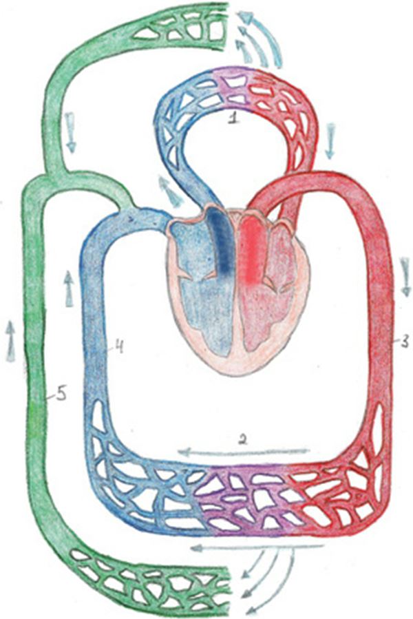 Рис. 2. Круги кровообращения и лимфатическая система. 1 – малый круг кровообращения, 2 – большой круг кровообращения, 3 – артериальное русло, 4 – венозное русло, 5 – лимфатическая система. Стрелками указано направление тока жидкости