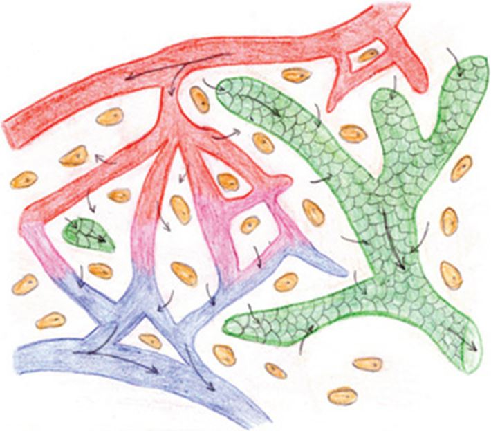 Все мы знаем, что у человека есть кровеносная система и что она из себя представляет. От сердца идут артерии, по ним к органам поступает кровь. И чем дальше они идут, тем меньше становятся, постепенно распадаясь на мельчайшие сосудики, которые называются капиллярами. По артериальным сосудам идет кровь, богатая кислородом, которым она снабжает клетки нашего организма. Также она к ним доставляет различные вещества – чтобы клетки могли питаться, работать, взаимодействовать с остальным организмом. Стенка артериального капилляра, если сказать упрощенно, представляет собой решето: со множеством отверстий, через которые могут пройти частички только с соответствующим им размером. Из артериальных капилляров в межклеточное пространство выходят молекулы веществ, и вместе с ними выходит определенный объем жидкости. Мы возьмем этот объем за 100 %.